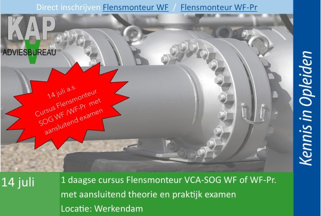 Op 14 juli a.s. organiseren wij in Werkendam een 1-daagse cursus Flensmonteur WF VCA SOG en Flensmonteur volgens protocol WF-Pr VCA SOG met direct aansluitend examen.