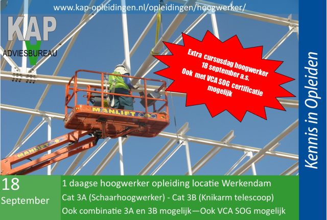 18 september a.s. organiseren wij een extra cursusdag Hoogwerker cat. 3A (schaarplatform) en cat. 3B (knikarm telescoop). Ook combinatie mogelijk. Ook mogelijk met VCA SOG examen. Bel 0183-405951 of mail opleidingen@kap-advies.nl om snel in te kunnen schrijven.